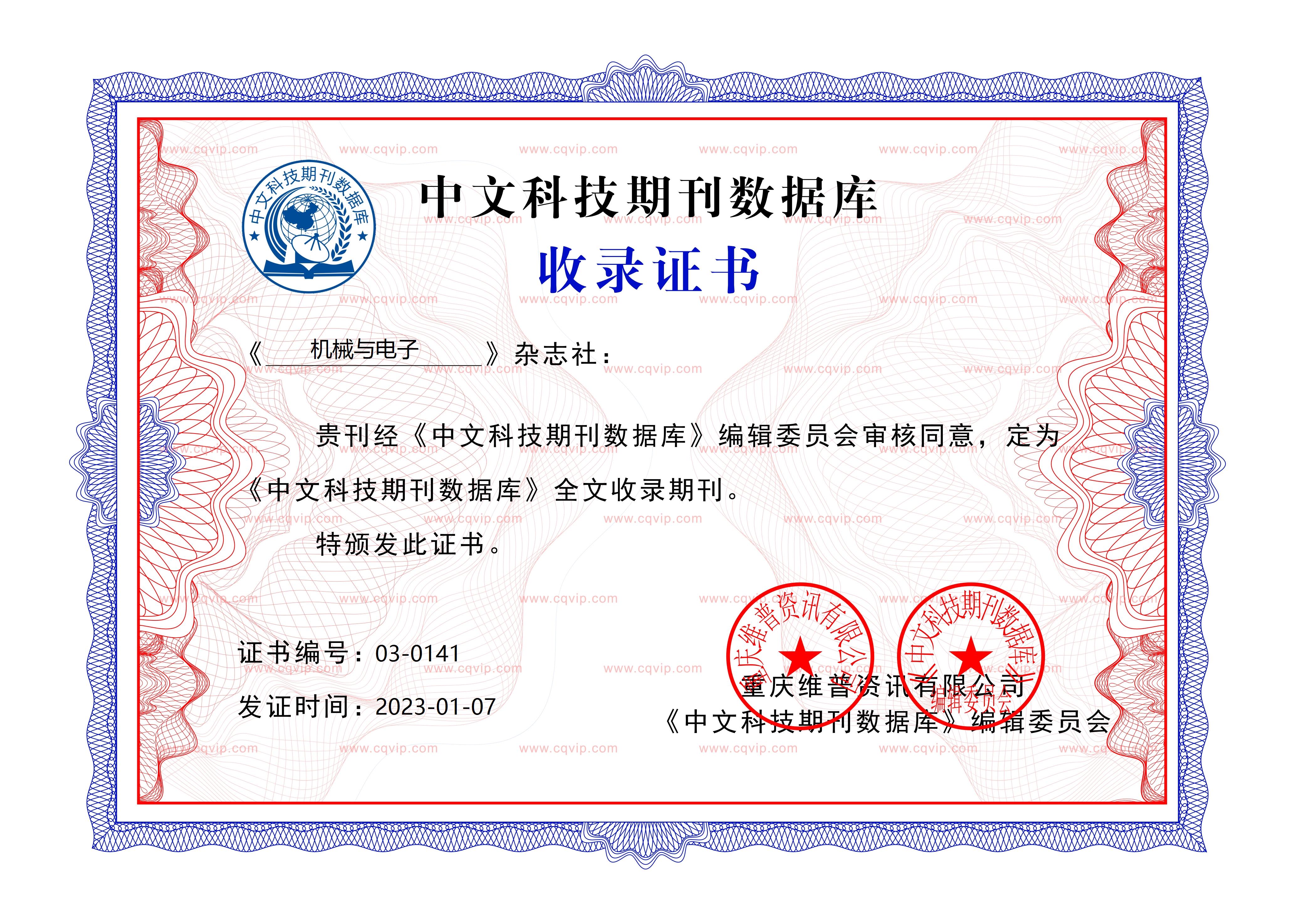《机械与电子》2023年重庆维普收录证书